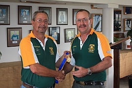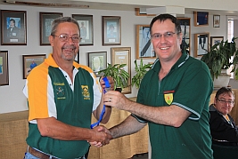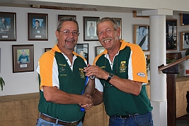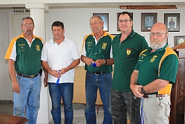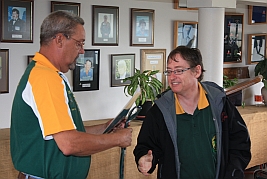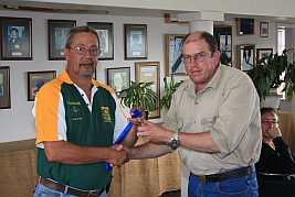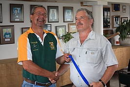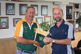 Hubert Heydenrych receiving his BPSU Colours from Merwe van Rensburg for his appointment as Match Director for the MLAIC World Championships in September 2013 |