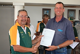 Pieter Truter receiving his letter of appointment from Merwe van Rensburg as Protea Team Manager for the MLAIC World Championships in September 2013 |